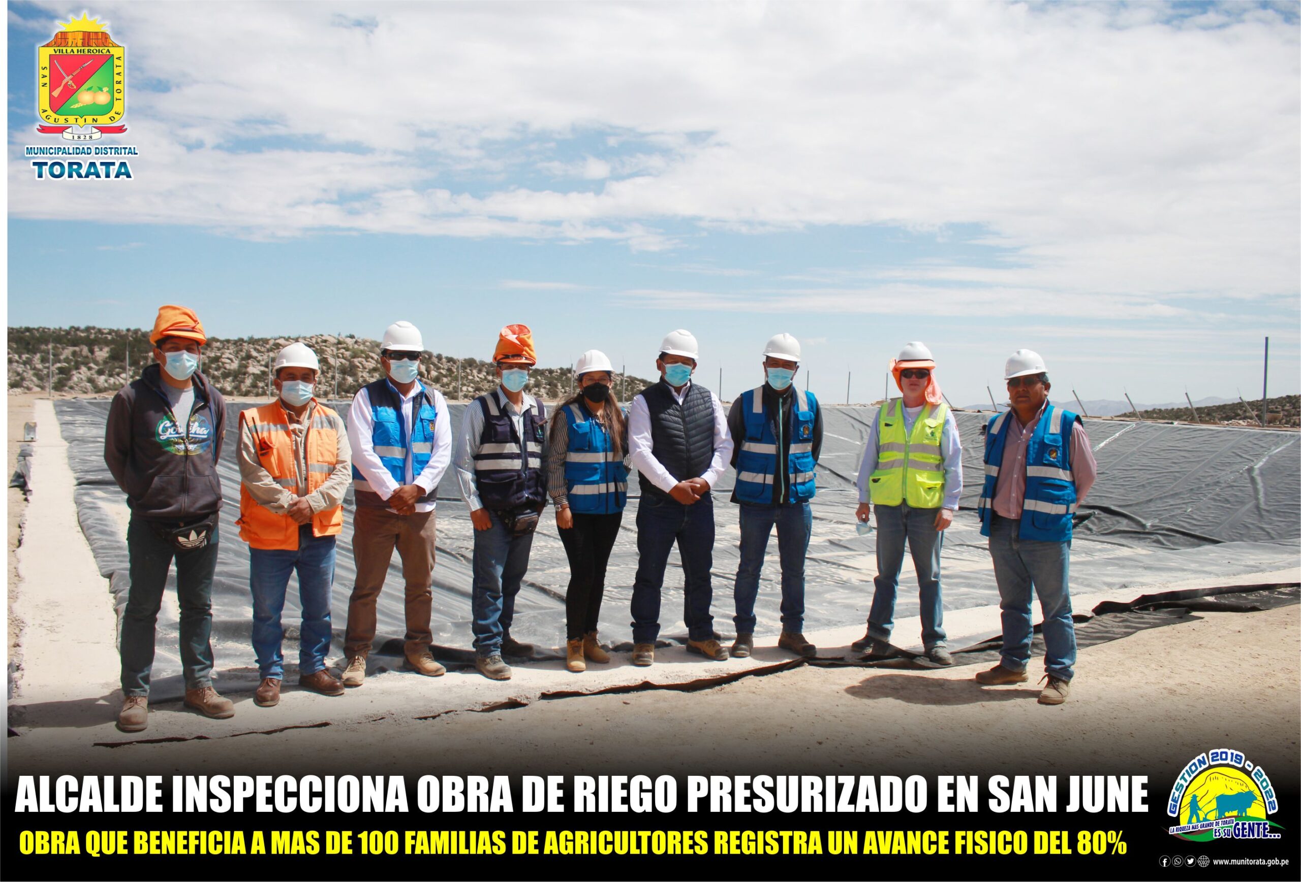 Con la finalidad de verificar el correcto avance de las obras en el Distrito de Torata, el Alcalde de la Municipalidad Distrital de Torata, Abog. Hernán Juárez Coayla, inspeccionó el avance físico del Proyecto “Mejoramiento y Ampliación del Servicio de Agua para Riego mediante Sistema Presurizado por Goteo en el Anexo de San Juan San June”, el cual registra un avance físico del 80%.
