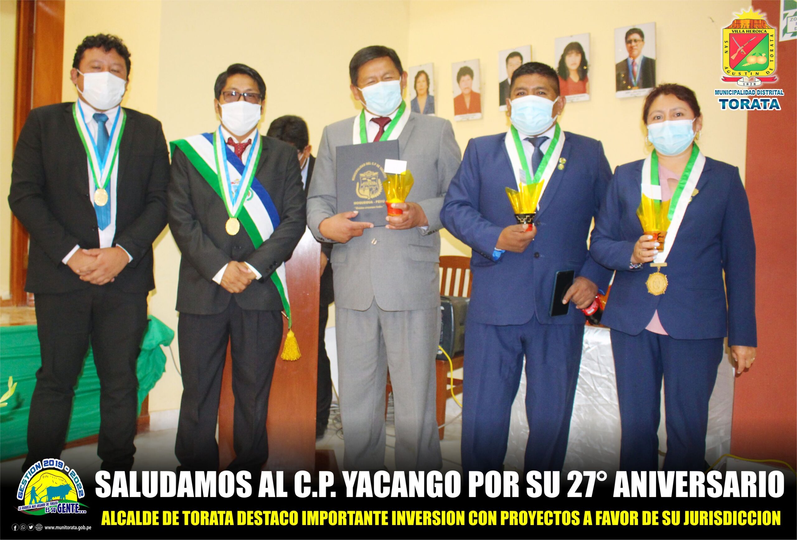 En el marco de las actividades centrales por el 27° Aniversario del Centro Poblado de Yacango, el Alcalde de la Municipalidad Distrital de Torata, Abog. Hernán Juárez Coayla, resalto el trabajo que se viene realizando por parte de la actual gestión municipal, en cuanto a la inversión con proyectos a favor del Centro Poblado de Yacango, destacando el cierre de brechas en cuanto a agua potable y saneamiento básico, a través de los proyectos: “Mejoramiento del Servicio de Agua Potable, Alcantarillado y Construcción de PTAP en Asociaciones AA.HH. Cerro Baúl, Cerro Mejía, Villa Yacango, Alto Yacango y Alto Maravillas” con una inversión de casi 03 millones de soles; “Instalación de los Servicios de Saneamiento Rural en los Sectores de Nueva Cala Cala, ASPAEX, ASPAEX I y ASPAEX III (Los Caribeños)” con una inversión de 8.6 millones de soles; así como la pronta culminación del Proyecto de Instalación del Servicio de Agua Potable y Construcción de PATP en la Junta Vecinal Doce Quebradas y Asociaciones Nueva Esperanza, Buenavista Once, Nuevo Yacango, Alegoma Rinconada, Alto Coplay, El Mirador y Rápida Mollesaja” con un presupuesto de más de 09 millones de soles.