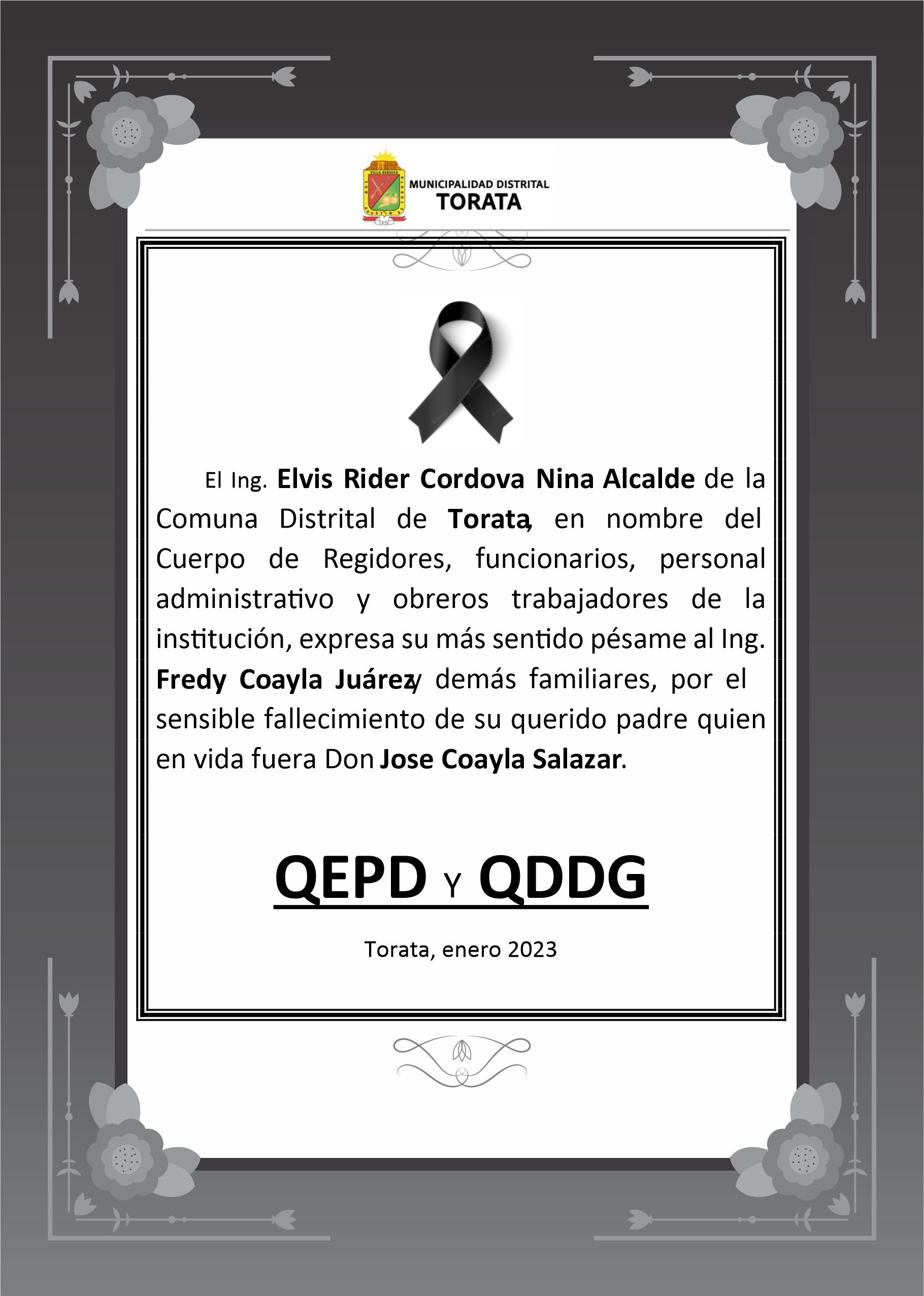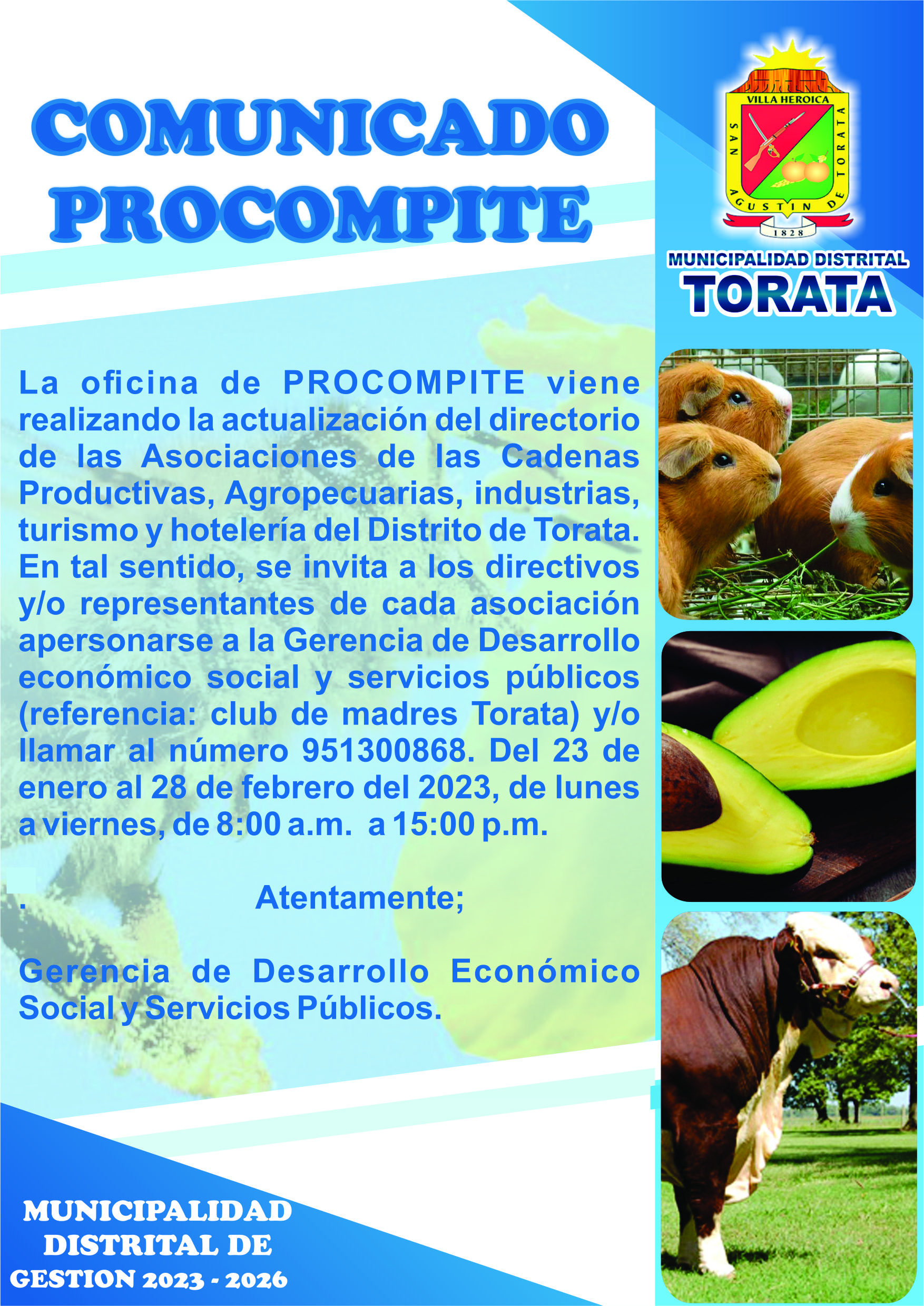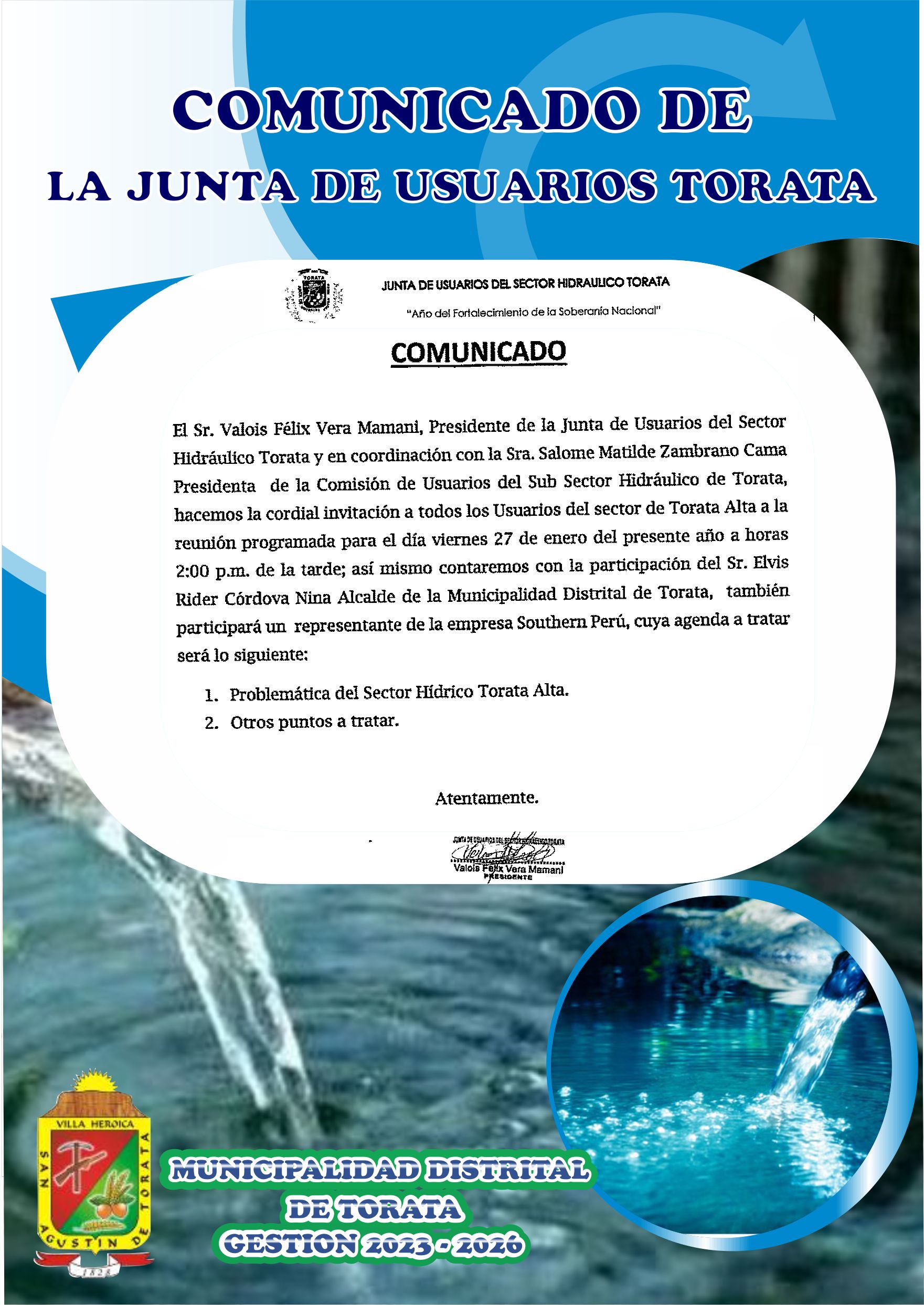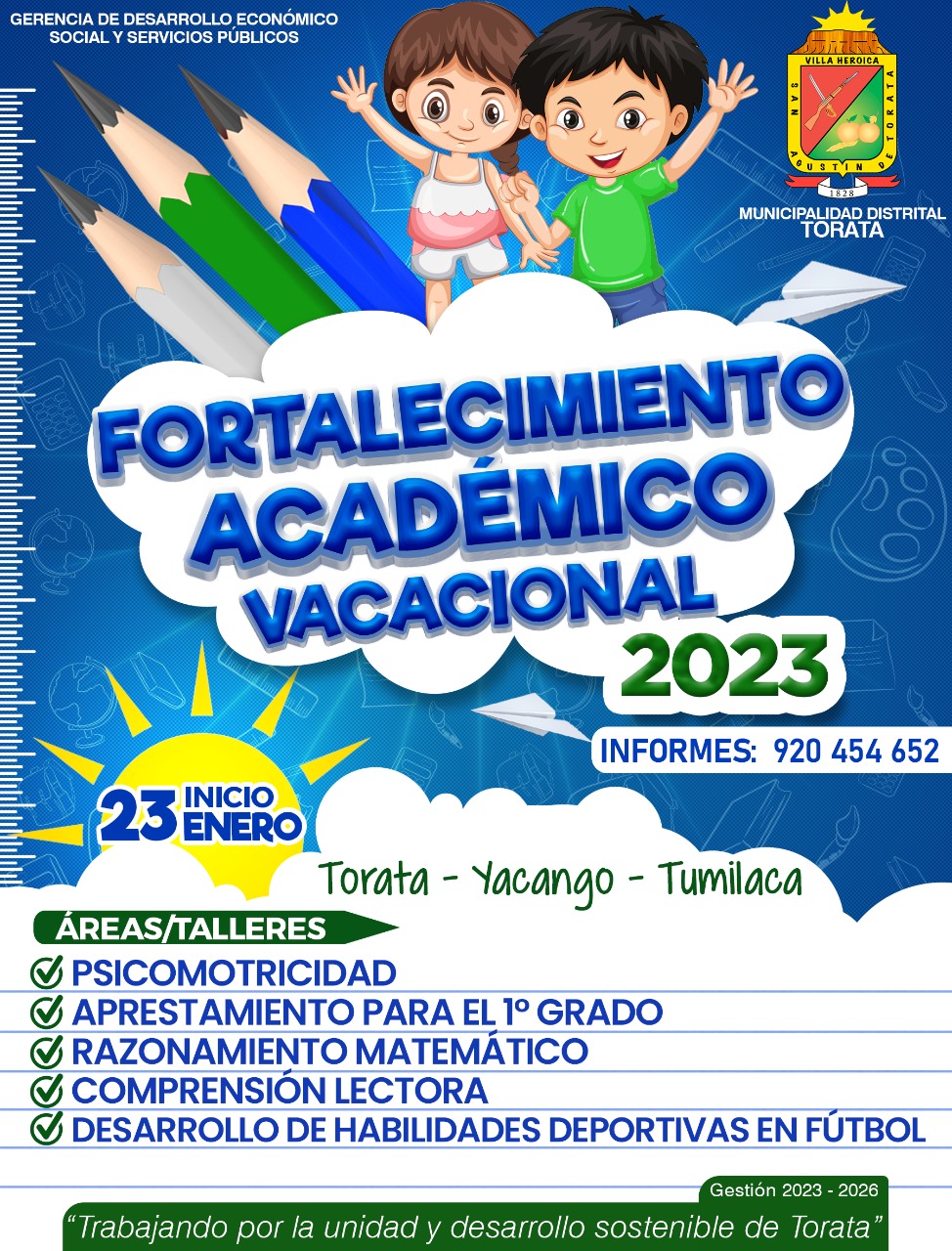 La Municipalidad Distrital de Torata brindando apoyo a los jóvenes torateños mediante el programa jóvenes chambeando comunica que la fecha de inicio de los trabajos para el primer grupo de 90 jóvenes será el 1ro de febrero y para el 2do grupo será el 20 de febrero.