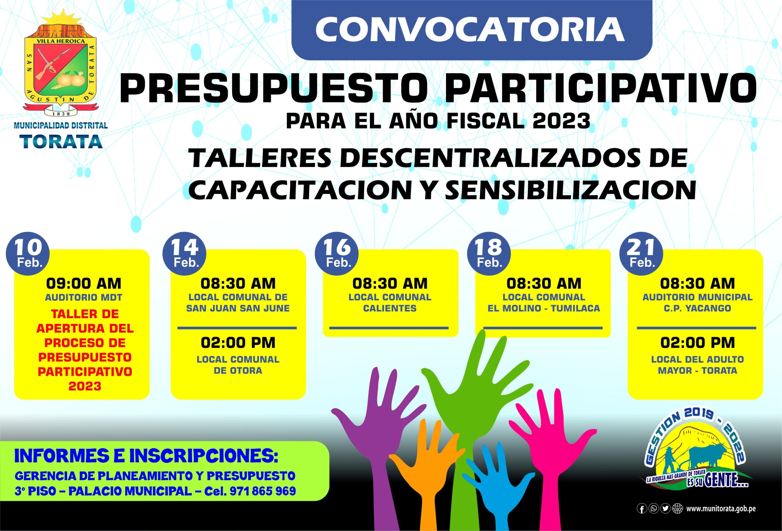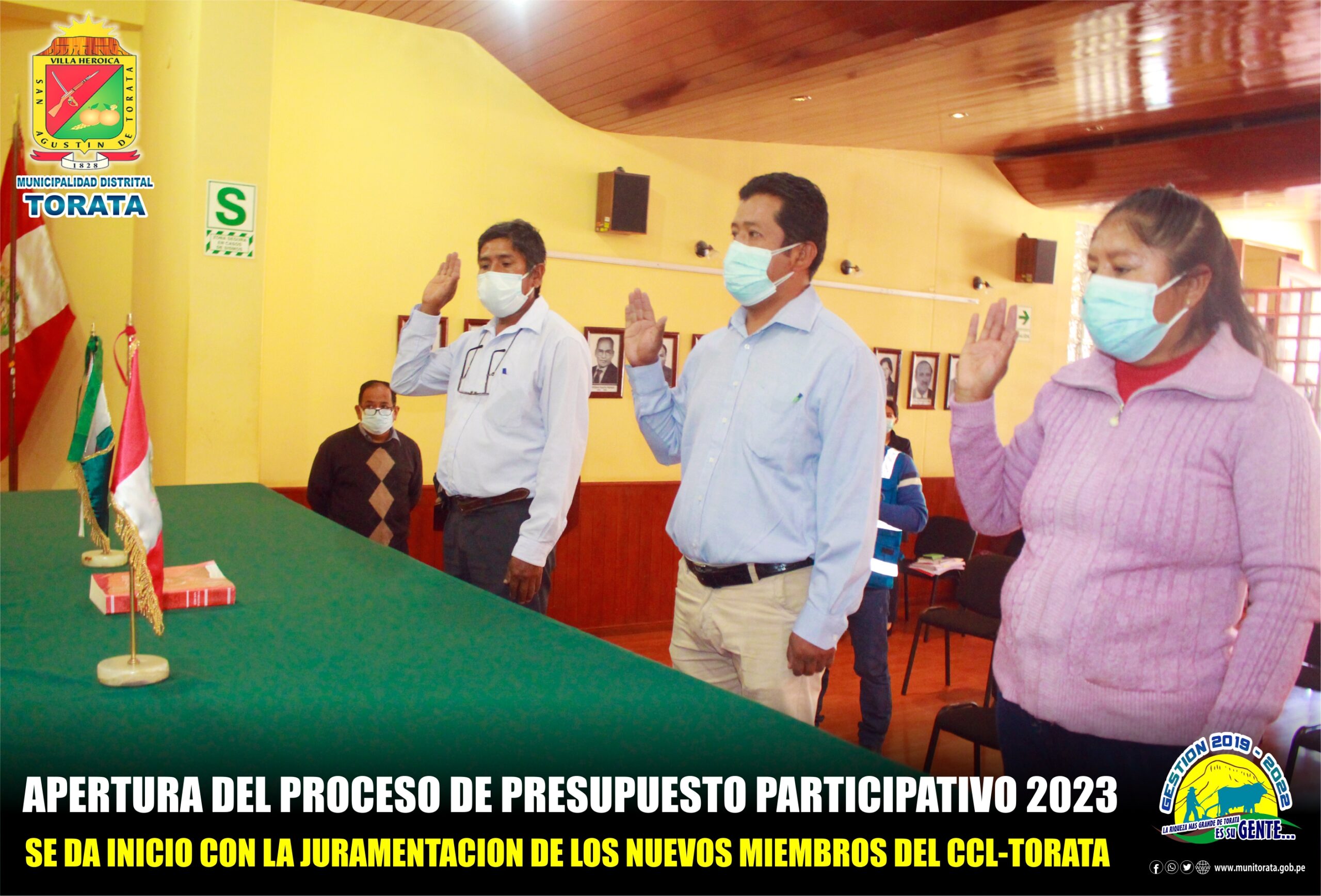 Cumpliendo con la normativa establecida en la Ley Marco del Presupuesto Participativo, la Municipalidad Distrital de Torata dio inicio al desarrollo de talleres de tal proceso para el año fiscal 2023, con la instalación y juramentación del Consejo de Coordinación Local, así como la exposición y lineamientos importantes del proceso por parte de la Gerencia de Planeamiento y Presupuesto.
