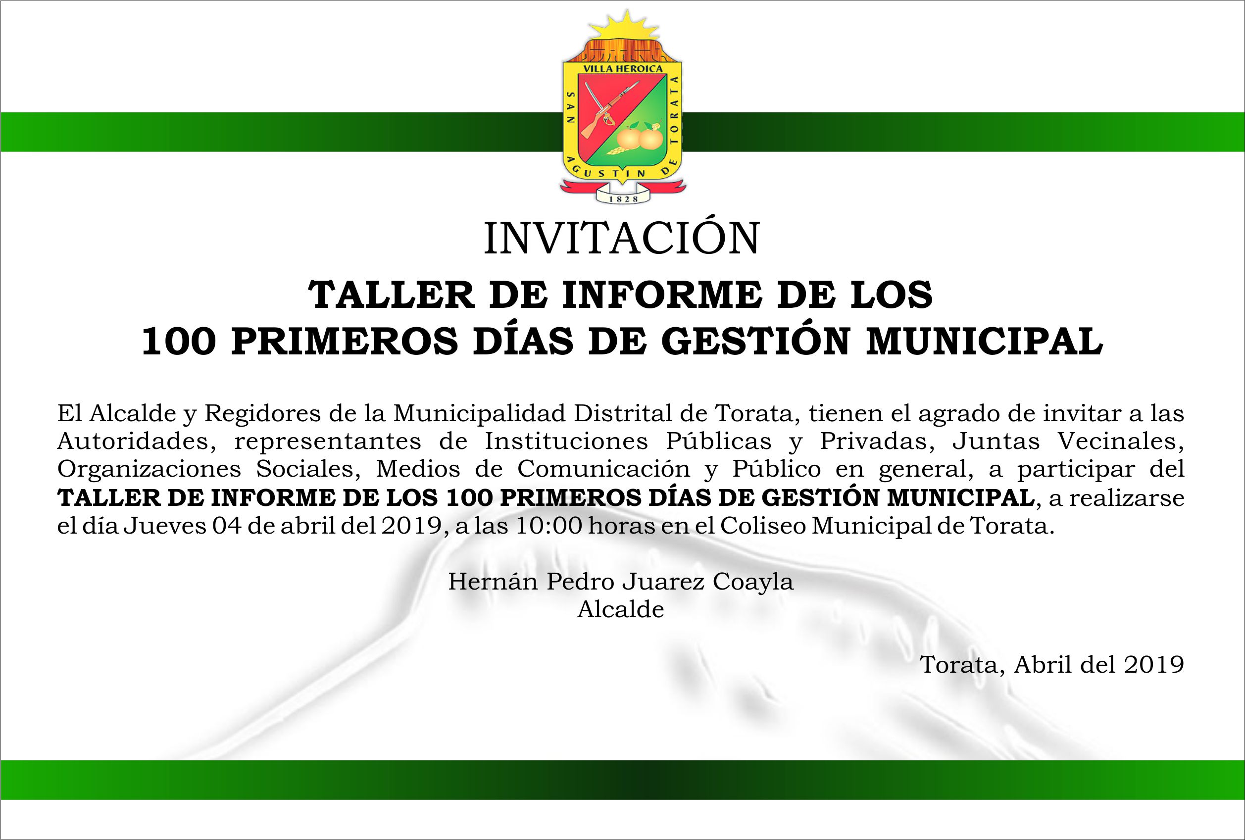 Como resultado de las gestiones realizadas por el Alcalde de la Municipalidad Distrital de Torata, Sr. Hernán Pedro Juarez Coayla, ante diferentes entidades del Gobierno Central, y con el respaldo del Despacho del Congresista de la República Dr. Vicente Zeballos Salinas, se obtuvo la asignación en uso de una moderna Camioneta, que formará parte del patrimonio de la entidad municipal para atender diferentes demandas de trabajos en el Distrito así como demás acciones por parte de la alta dirección y apoyo a otras instituciones del Distrito.