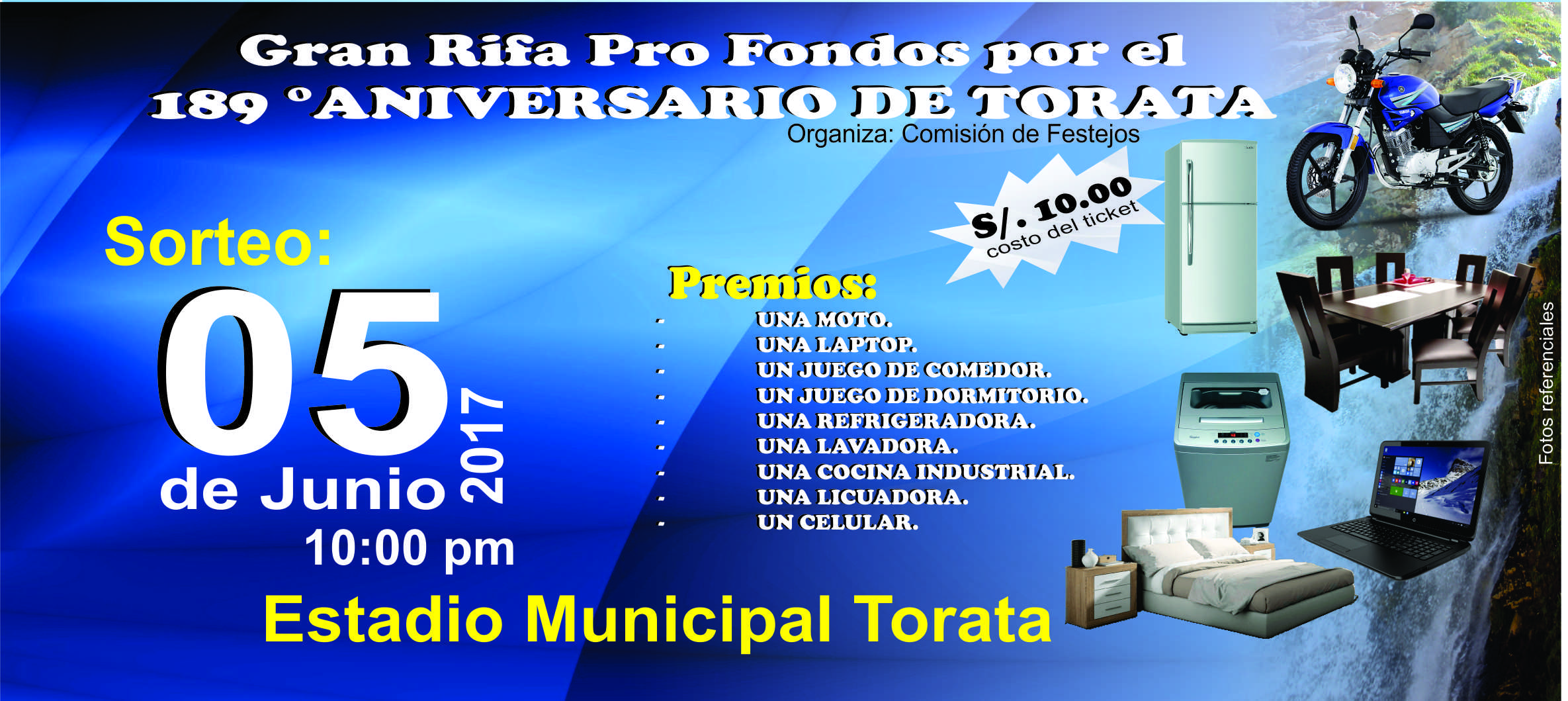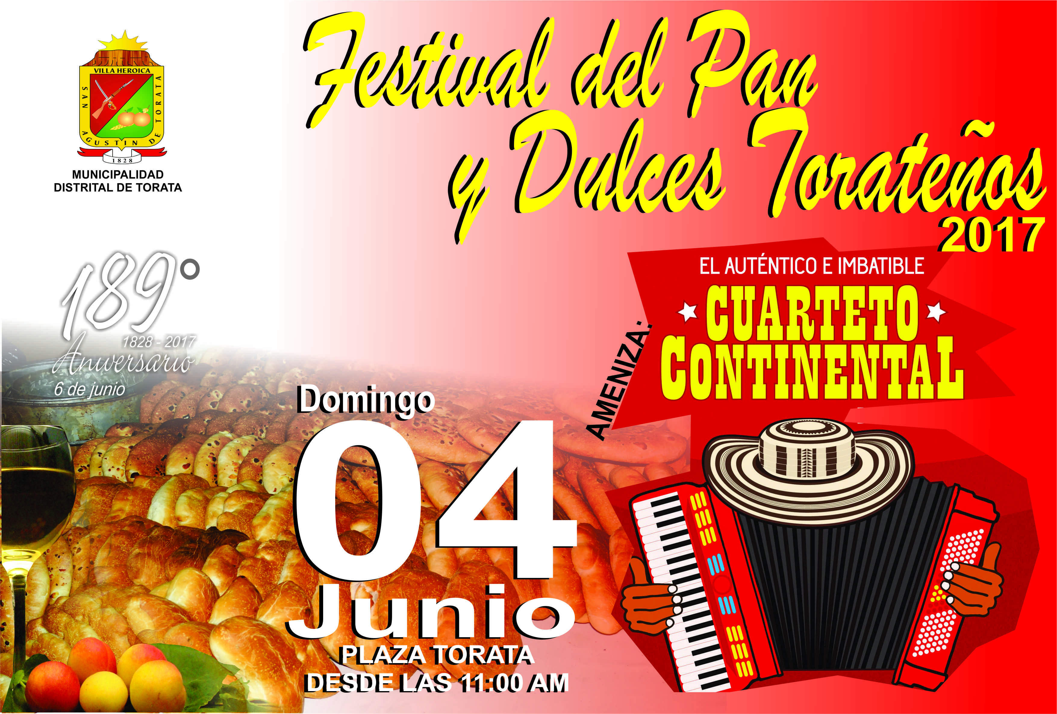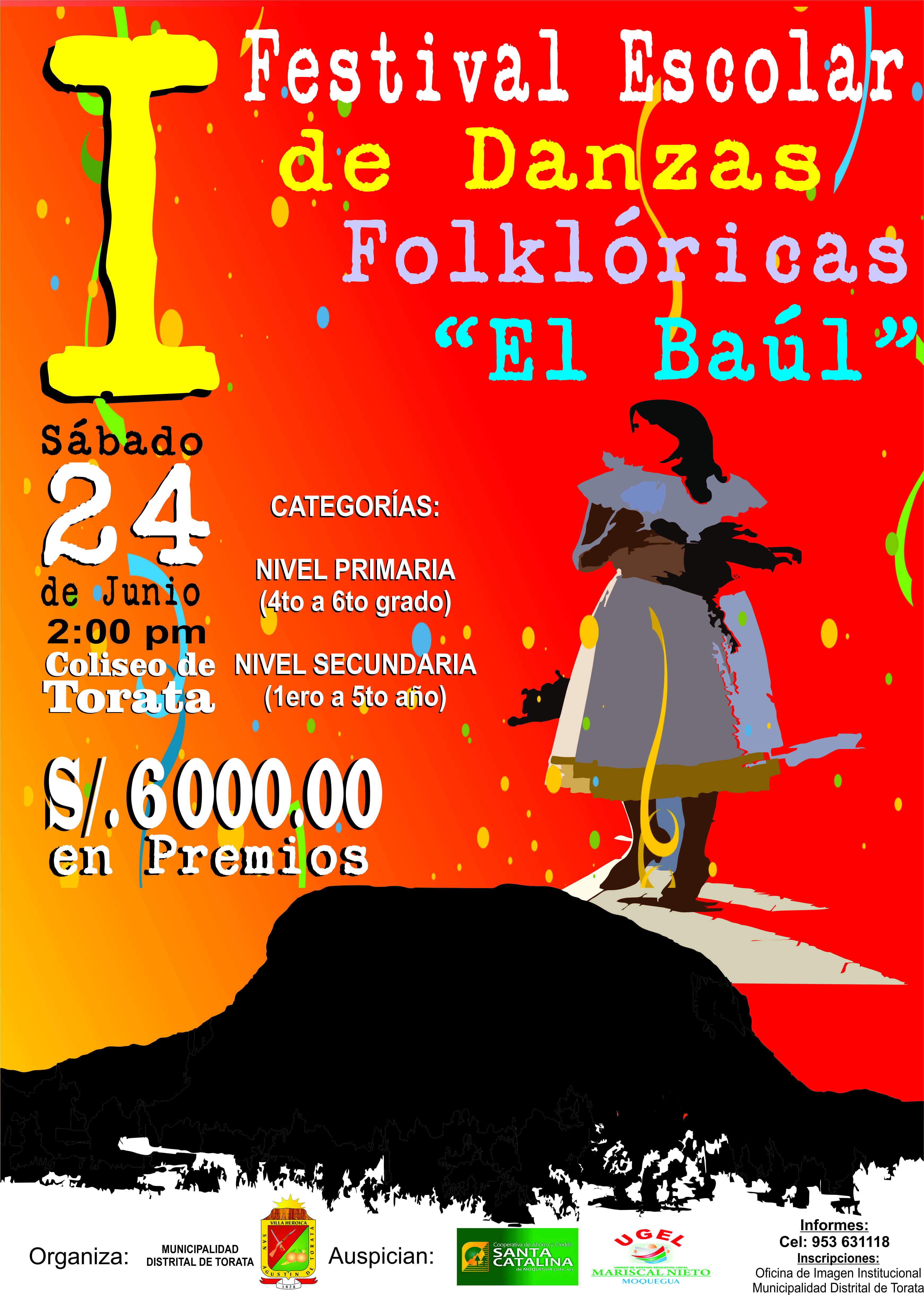 La Comisión de Festejos, con motivo de celebrar el 189º Aniversario de Elevación a Villa Heroica de Torata, organiza el I FESTIVAL ESCOLAR DE DANZAS FOLCLÓRICAS “EL BAÚL”, a realizarse en la fecha 24 de JUNIO del presente año, en las instalaciones del Coliseo Municipal Torata.