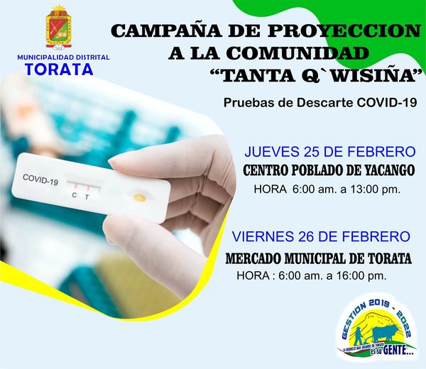 La Municipalidad Distrital de Torata a través del Departamento de Seguridad y Salud en el Trabajo inicia la campaña de proyección a la comunidad “Tanta Q´wisiña”(Luchemos Juntos), en ese sentido mañana Jueves 25 de Febrero, el personal asistencial se trasladará al Centro Poblado de Yacango para aplicar pruebas serológicas de descarte de covid-19, se atenderá en el horario de 6:00 a 13:00 horas. El Viernes 26 de Febrero continuara la campaña en el Mercado Municipal se atenderá en el horario de 6:00 a 16:00 horas.