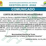 La Unidad de Rentas y Servicios Públicos de la Municipalidad Distrital de Torata, comunica a los señores usuarios del servicio de Agua para Consumo Humano del Centro Poblado Yacango, que por motivo de cumplimiento del cronograma de mantenimiento, lavado y desinfección de los reservorios y captaciones de agua para consumo humano, se estará realizando el corte del servicio el día Miércoles 27 de marzo del presente a partir de las 08:00 hrs. hasta las 15:00 hrs., por lo que se pide tomar las previsiones del caso a nuestros usuarios, a fin de almacenar el líquido elemento en recipientes limpios y adecuados.