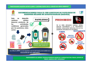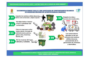 - Concientizar a los propietarios de las viviendas aledañas a estas vías, sobre la limpieza, orden y hábitos de recojo, así también, como del almacenamiento de basura.