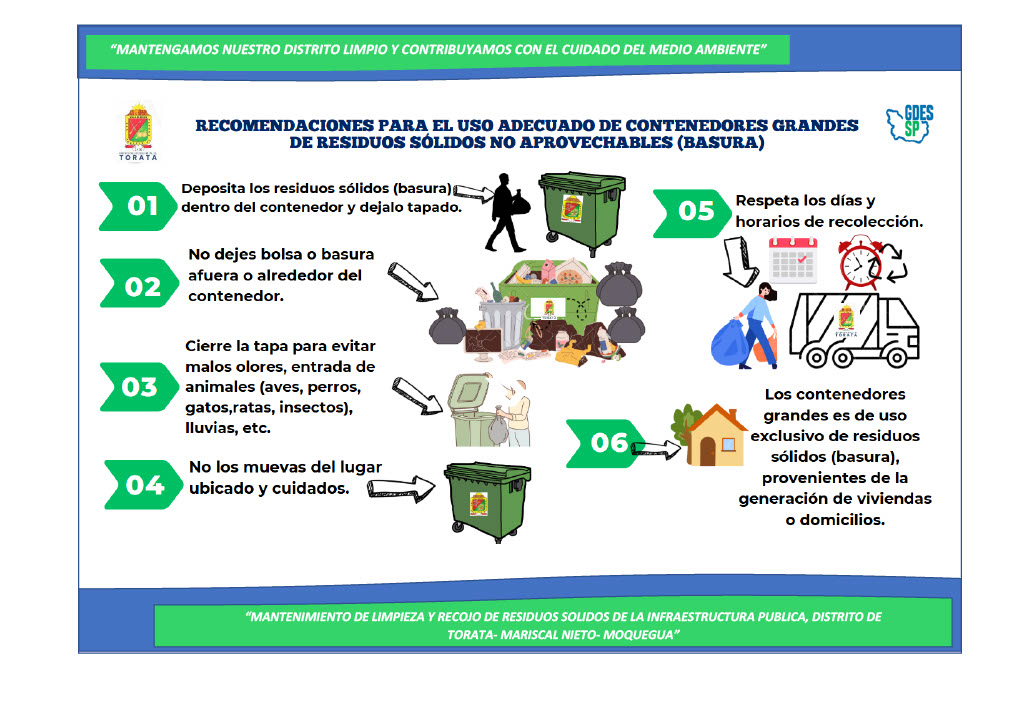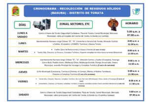 El área de limpieza pública se encarga de brindar las adecuadas condiciones de vida a la población del centro urbano, realizando la recolección de residuos sólidos y domésticos del Distrito de Torata y de los sectores de Jorge Chávez sector “A” y sector “B”, la Pascana, Tumilaca y San Juan San June.