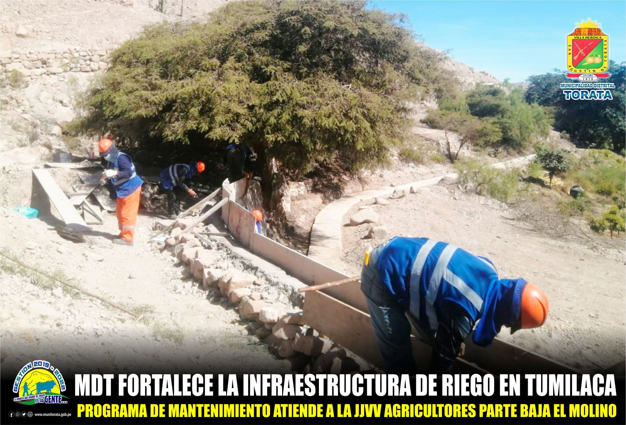 Gracias a las gestiones de las autoridades de la Junta Vecinal Agricultores Parte Baja El Molino Tumilaca, la Municipalidad de Torata, a través del Programa de Mantenimiento, realizó el mantenimiento del Sistema de Riego y Accesos Peatonales en la referida Junta Vecinal, la cual permite optimizar el uso del recurso hídrico para el riego de los cultivos de paltos, entre otros.