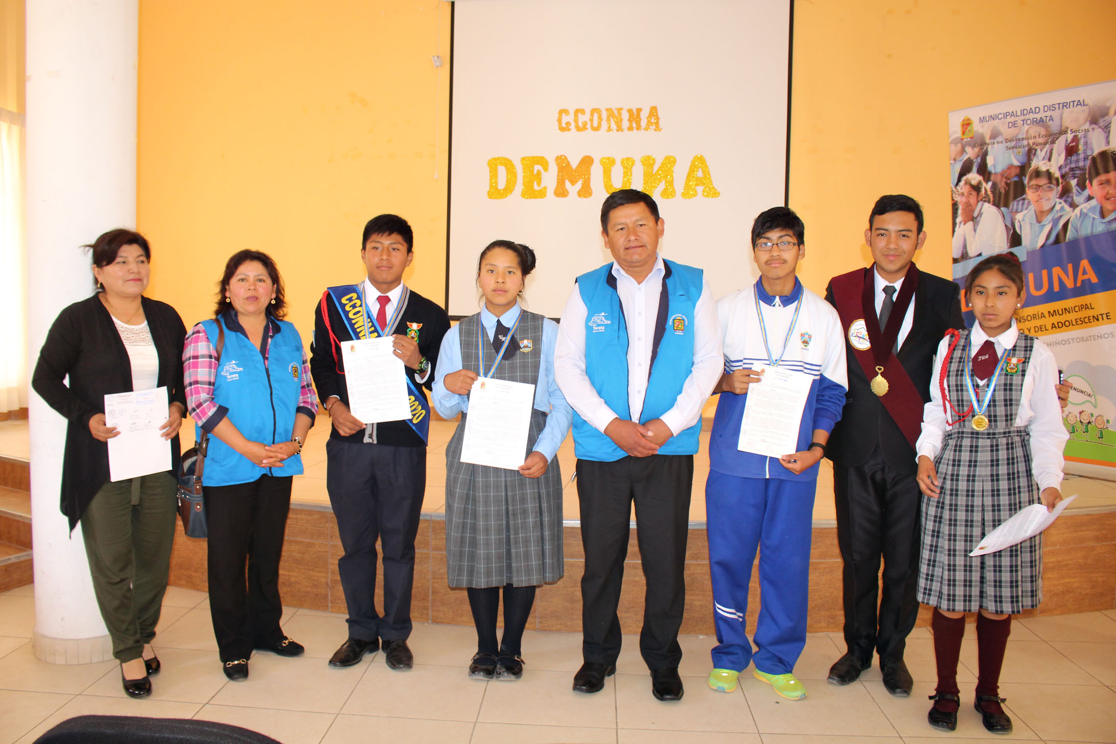 El Alcalde de la Comuna Distrital Hernán Juarez Coayla fue el encargado de tomar juramento e imponer las medallas y entregar las respectivas resoluciones de reconocimiento, además mostró su satisfacción de que la niñez y adolescentes del Distrito puedan involucrarse en el desarrollo de políticas públicas y fortalecerse para convertirse en ciudadanos de bien para Torata.