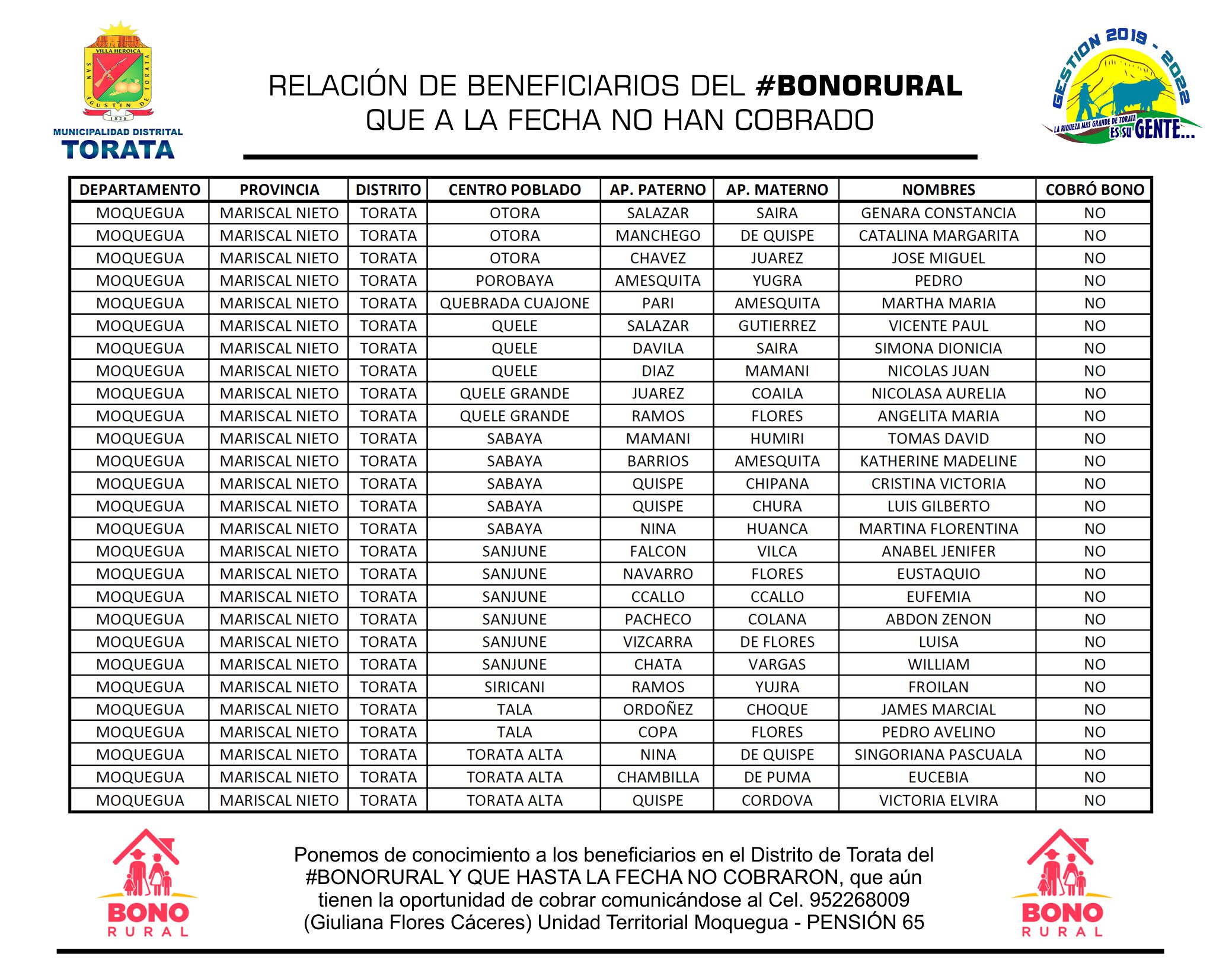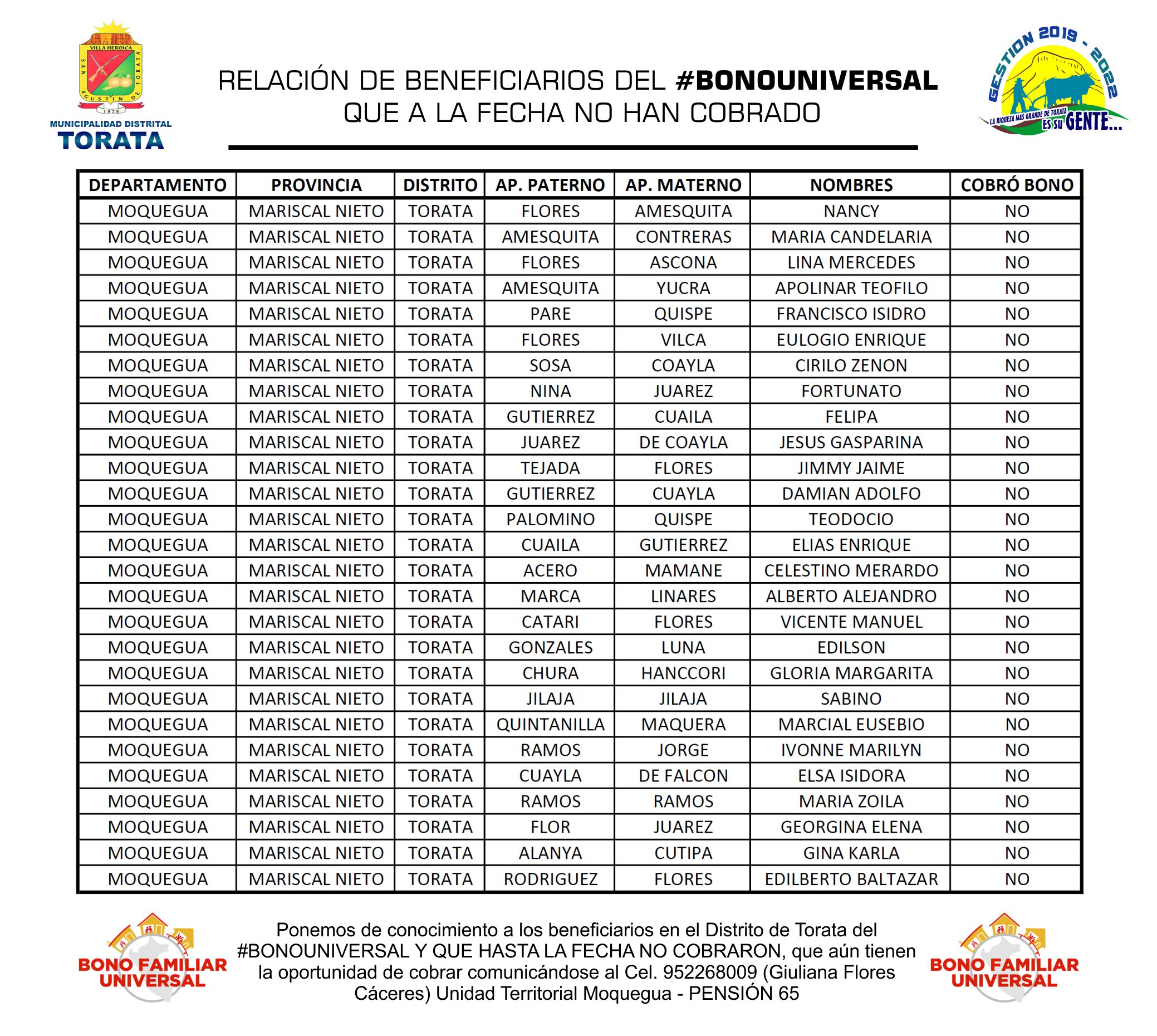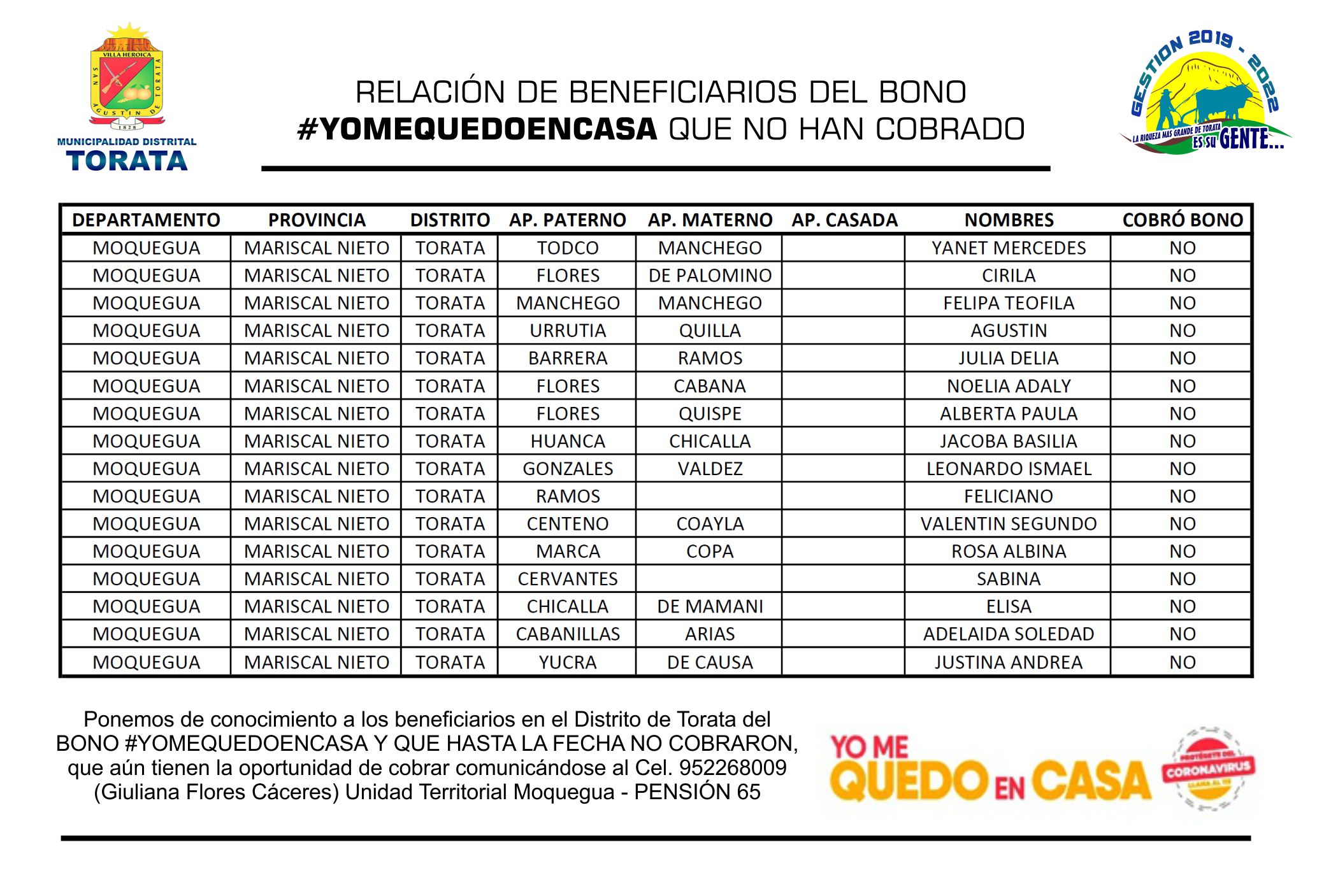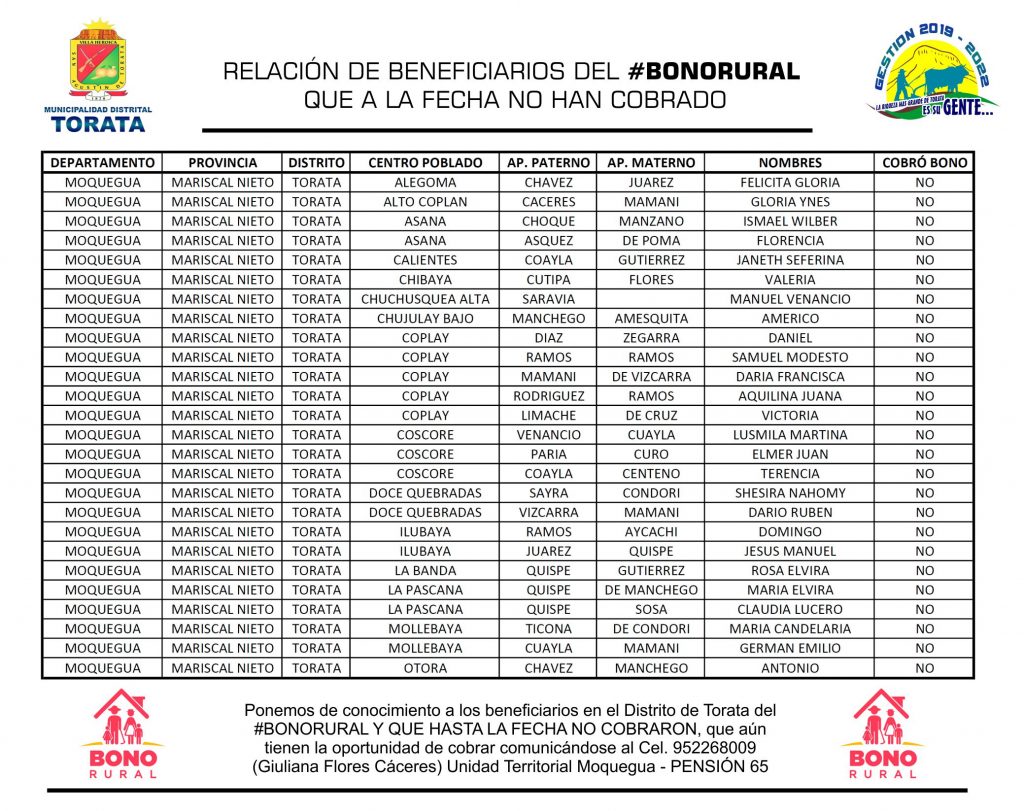 La Municipalidad Distrital de Torata informa para conocimiento público la relación de beneficiarios de los subsidios monetarios ante la emergencia sanitaria de #BonoYoMeQuedoEnCasa #BonoRural #BonoUniversalFamiliar QUE A LA FECHA NO HAN COBRADO; se les recuerda que aún tienen la oportunidad de cobrar presentándose con su DNI en la Oficina del Banco de la Nación más cercana o comunicarse al Cel. 952268009 (Giuliana Flores Cáceres) Unidad Territorial Moquegua – PENSIÓN 65