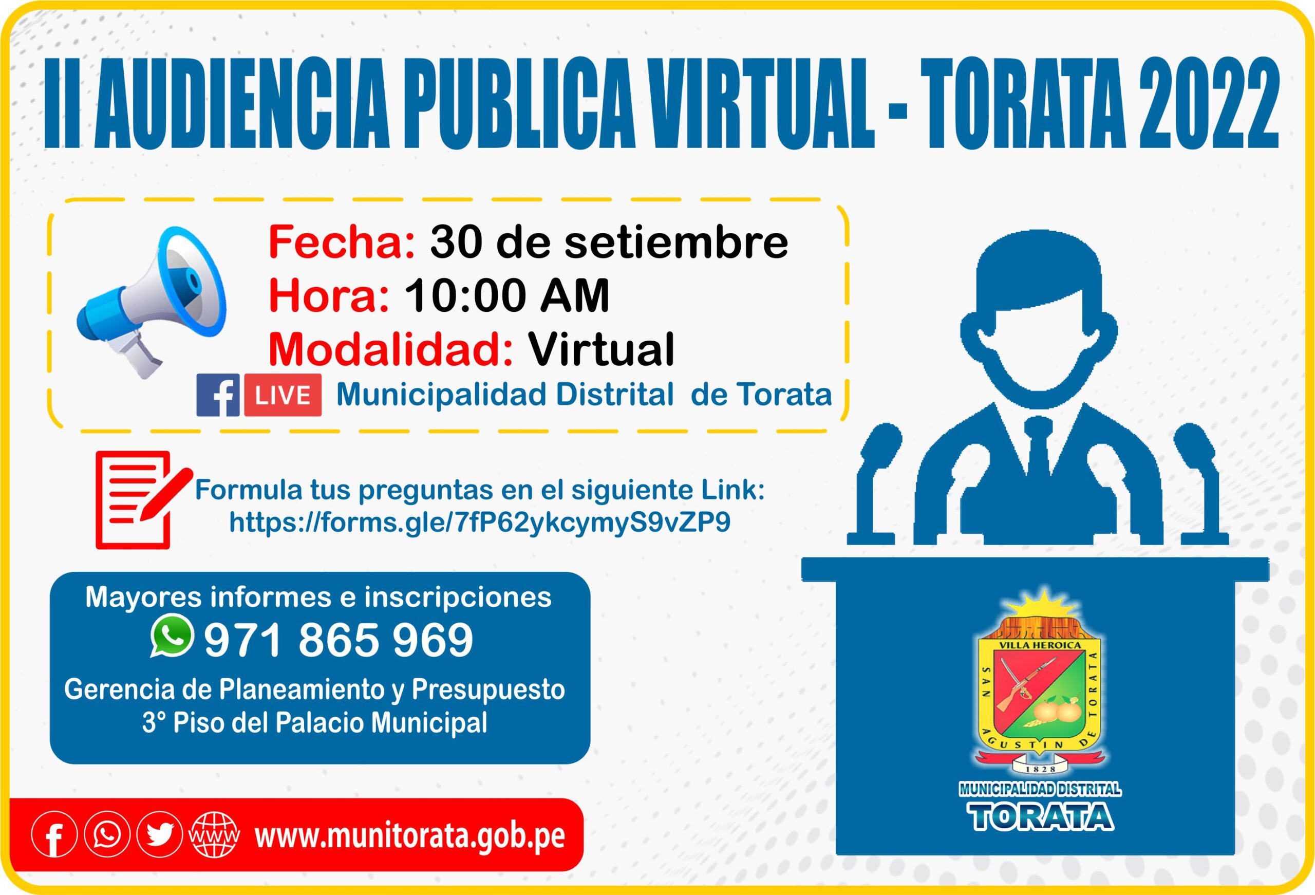 Para conocer mas sobre nuestros avances, logros y dificultades, la Municipalidad Distrital de Torata te invita a participar de la II Audiencia Pública Virtual del Año 2022.