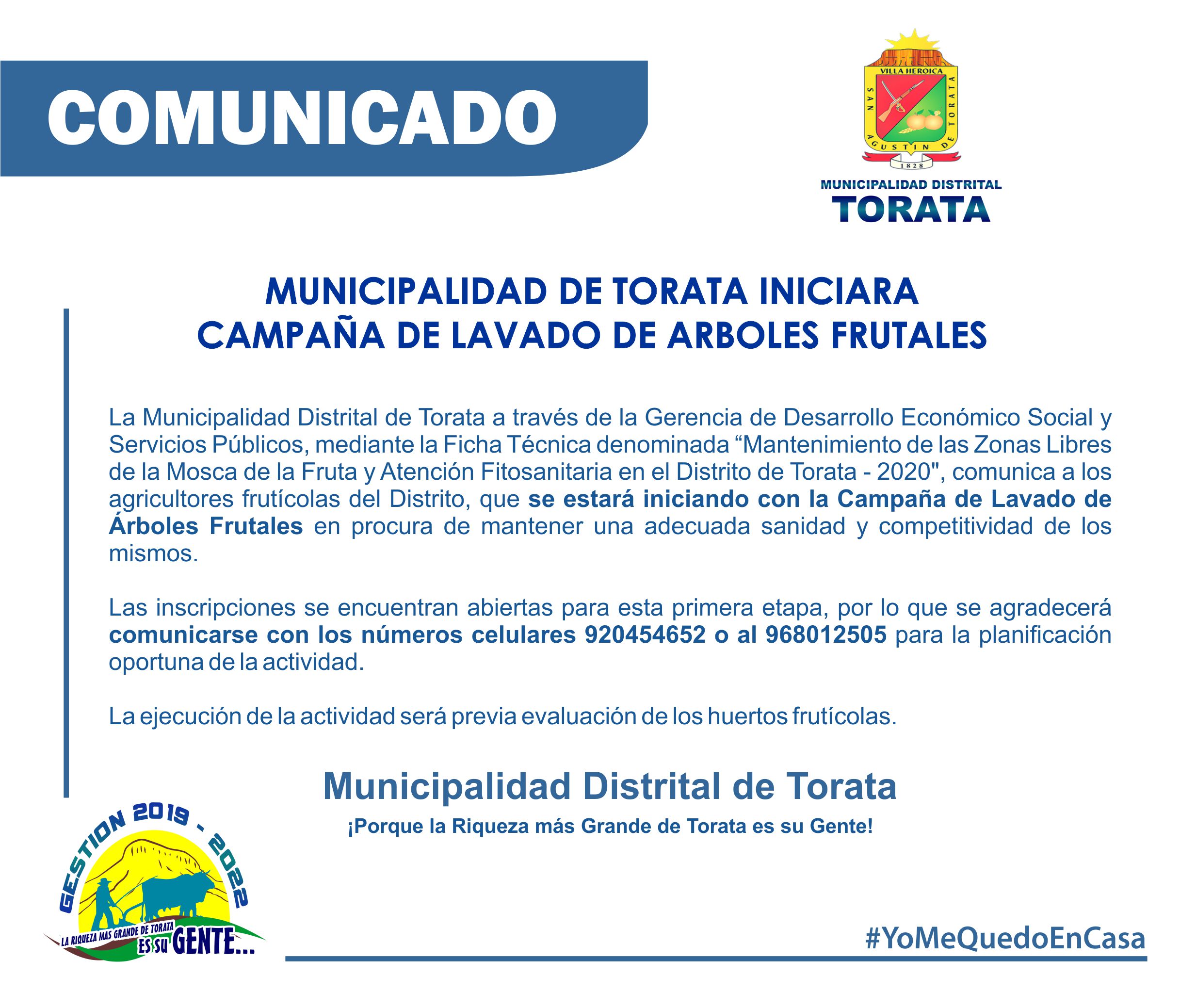 La Municipalidad Distrital de Torata a través de la Gerencia de Desarrollo Económico Social y Servicios Públicos, mediante la Ficha Técnica denominada “Mantenimiento de las Zonas Libres de la Mosca de la Fruta y Atención Fitosanitaria en el Distrito de Torata – 2020″, comunica a los agricultores frutícolas del Distrito, que se estará iniciando con la Campaña de Lavado de Árboles Frutales en procura de mantener una adecuada sanidad y competitividad de los mismos.