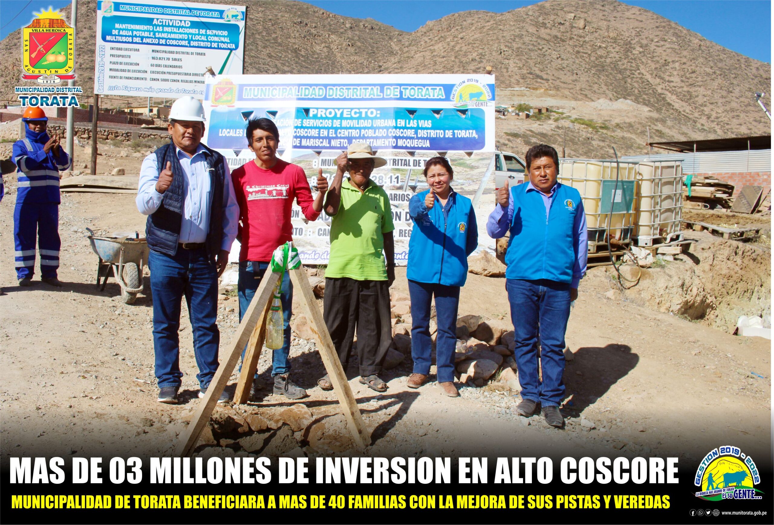 Atendiendo el pedido del poblado de Alto Coscore, la Municipalidad Distrital de Torata inicio la ejecución del Proyecto “Creación del Servicio de Movilidad Urbana en las Vías Locales del Anexo de Alto Coscore en el Sector Poblado de Coscore”, con una inversión de 03 millones 293 mil 528 soles.