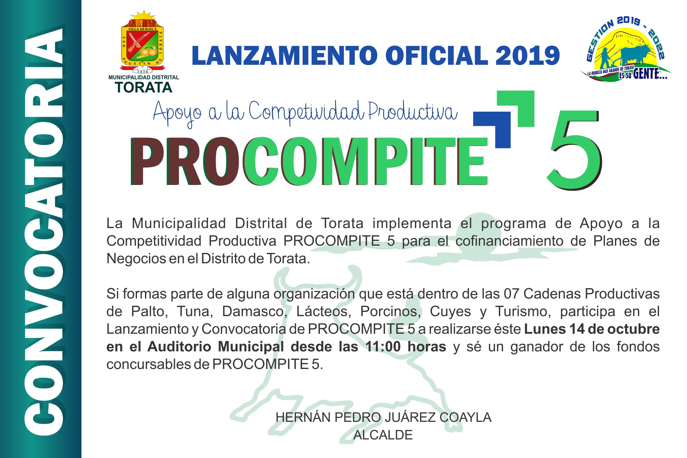 La Municipalidad Distrital de Torata, liderada por su Alcalde Hernán Juárez Coayla y con el respaldo del Concejo Municipal, implementa en el presente año 2019, el programa de Apoyo a la Competitividad Productiva PROCOMPITE 5, para el cofinanciamiento de propuestas productivas (Planes de Negocios) y fortalecer la actividad empresarial en el Distrito de Torata.
