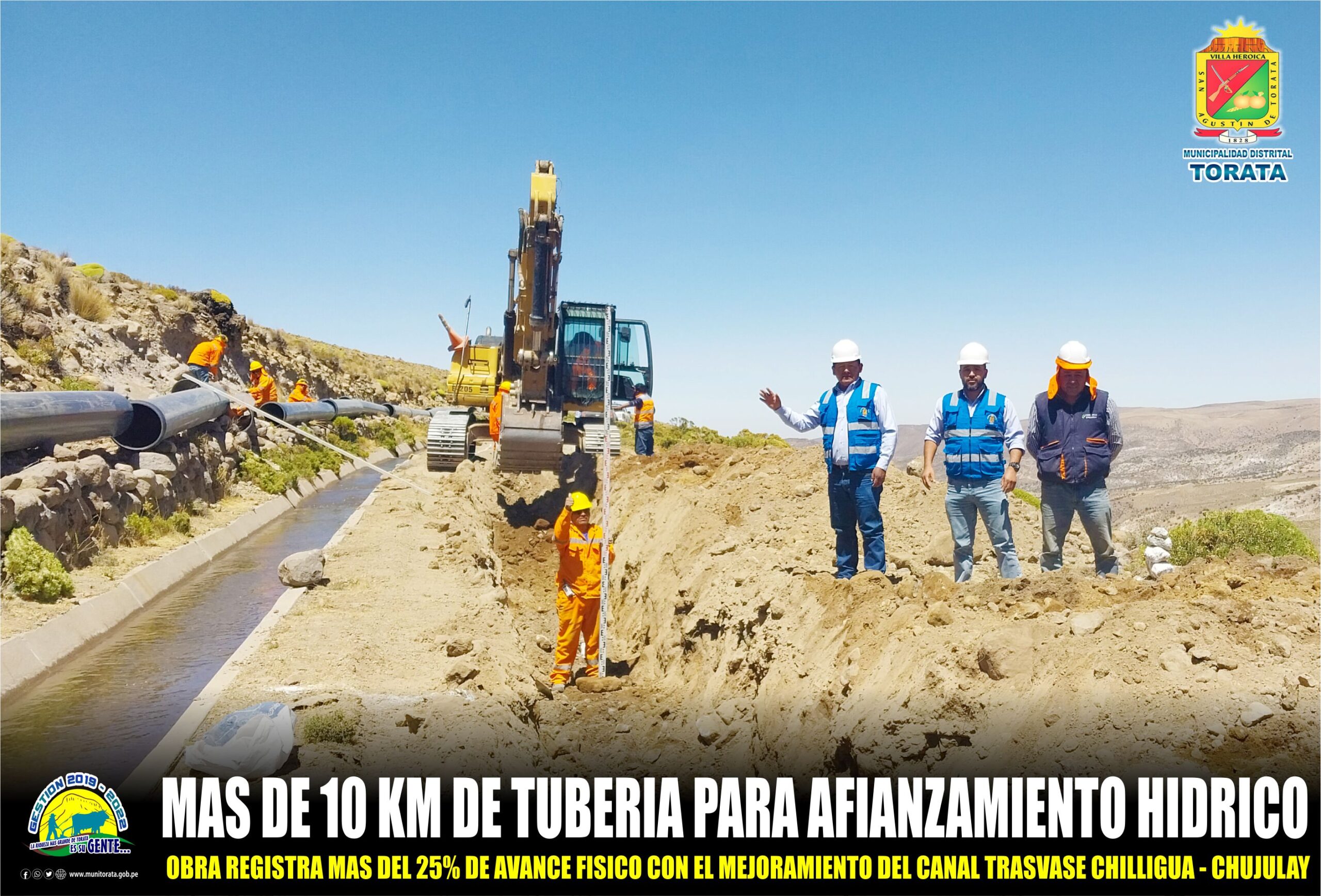 Los agricultores de Chujulay, Paralaque, Quele, Chuvilaque, entre otros, pertenecientes a la Comisión de Regantes Chujulay del Distrito de Torata, haran realidad el afianzamiento de su capacidad hídrica y de esta manera fortalecer el riego de sus cultivos gracias a la ejecución del Proyecto “Mejoramiento del Servicio de Provisión de Agua para Riego de la Infraestructura Hidráulica del Canal Trasvase Chilligua – Chujulay para el Afianzamiento Hídrico de la Comisión de Regantes Chujulay”, el cual se ejecuta por parte de la Municipalidad Distrital de Torata.