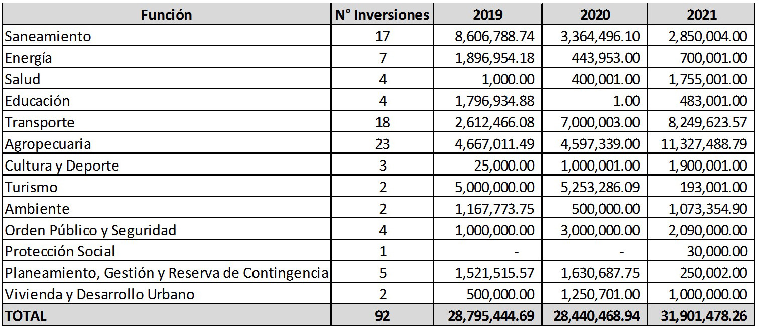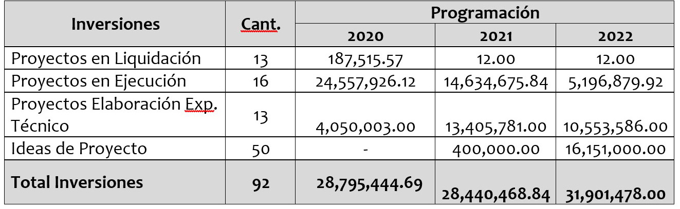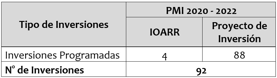 La cartera de inversiones del PMI 2020 – 2022, fue registrado con un total de 92 inversiones, de los cuales 04 corresponden a IOARRs y 88 son proyectos de inversión.