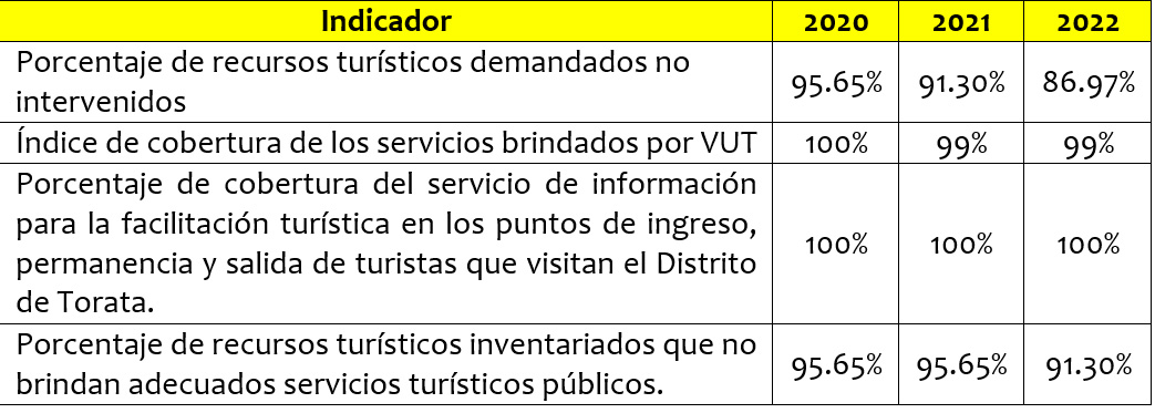 En el distrito de Torata se tiene un total de 14 Recursos Arqueológicos –Turísticos del cual se puede observar que del 100% de los recursos se encuentran en mal estado debido a que no han sido intervenidos. En cuanto a Bienes Inmuebles Virreinales y Republicanos (BIVRPCN declarados como patrimonio cultural de la nación son 10 recursos inventariados de propiedad del estado y de propiedad privada de los cuales 04 se encuentran intervenidos y 06 no intervenidos es por eso que la brecha es de 60%.