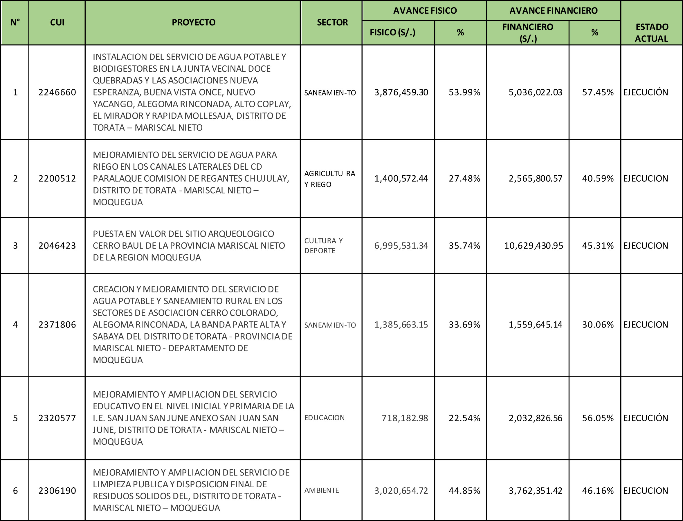- Mejoramiento del Servicio de Agua potable y saneamiento en la Junta Vecinal Alegoma, distrito de Torata – Mariscal Nieto – Moquegua. Código SNIP 212298, CUI 2214171.
