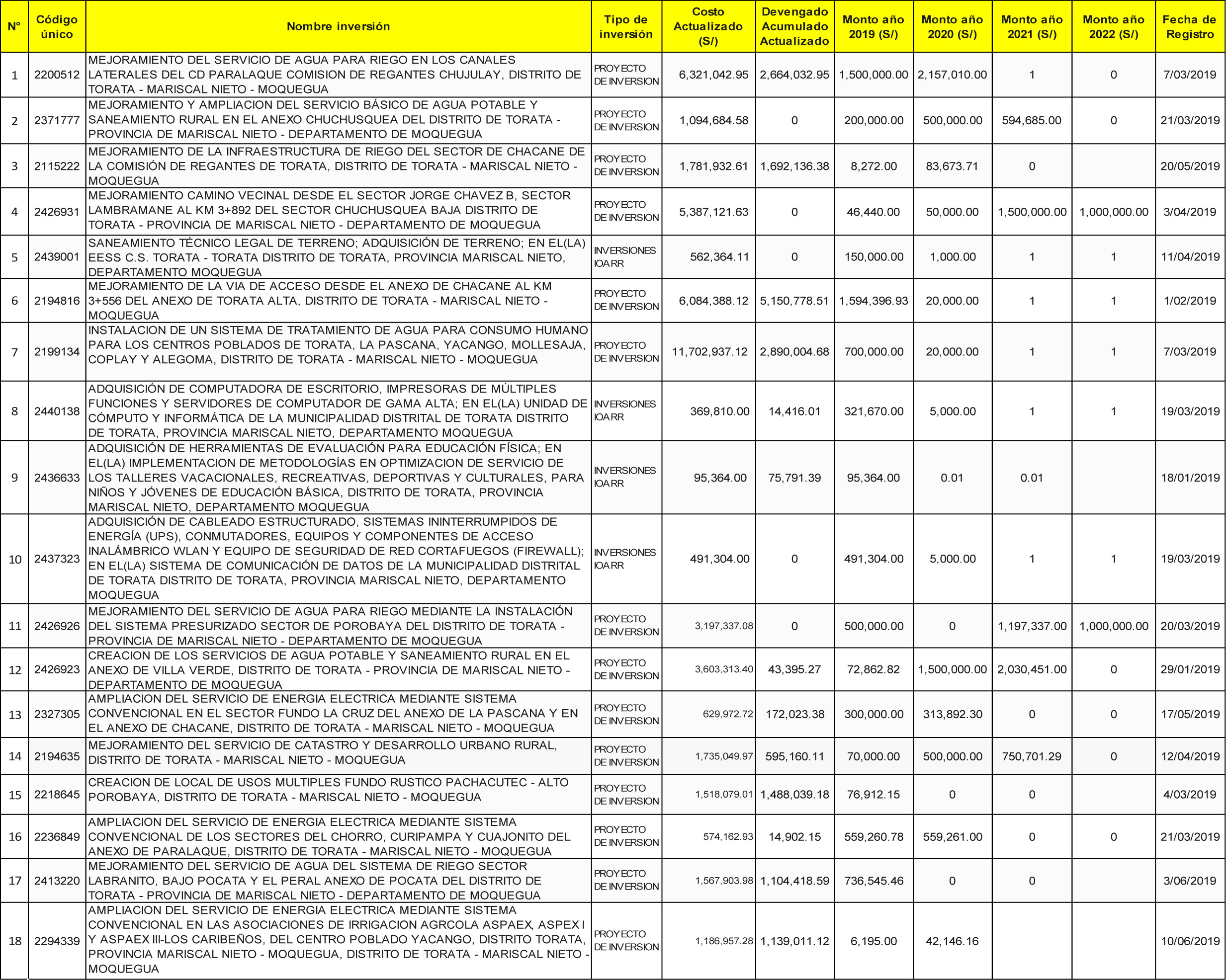 Mediante Resolución de Alcaldía N° 193-2019-A/MDT, de fecha 12 de Abril 2019, se aprueba la Programación Multianual de Inversiones 2020-2022 de la Municipalidad Distrital de Torata, que contiene los Criterios de Priorización, el Diagnóstico de Brechas y la Cartera de Inversiones. El Programa Multianual de Inversiones (PMI 2020-2022), fue elaborado en el marco de lo establecido en el artículo 14, 15 y 16 de la Directiva N° 001-2019-EF/63.01.