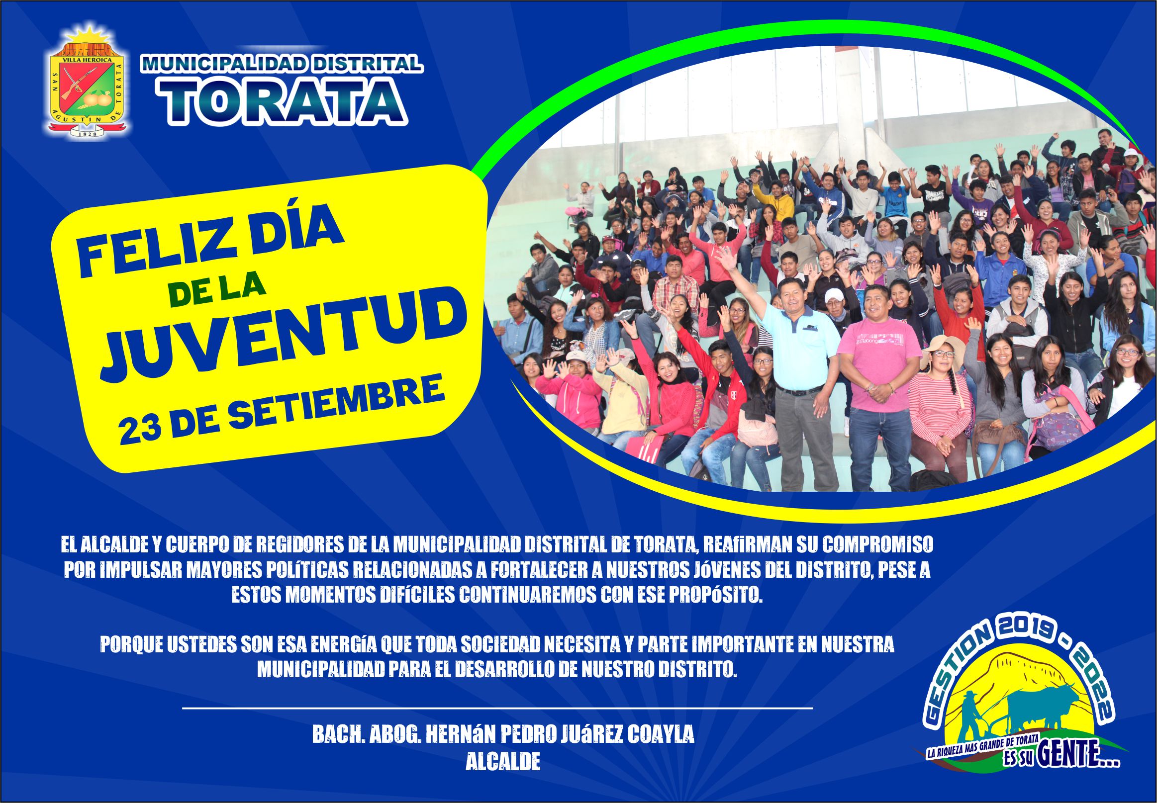 En ésta nueva estación de la Primavera saludamos a nombre del Alcalde y Cuerpo de Regidores de la Municipalidad Distrital de Torata a nuestros jóvenes del Distrito quienes forman parte del desarrollo de Torata.