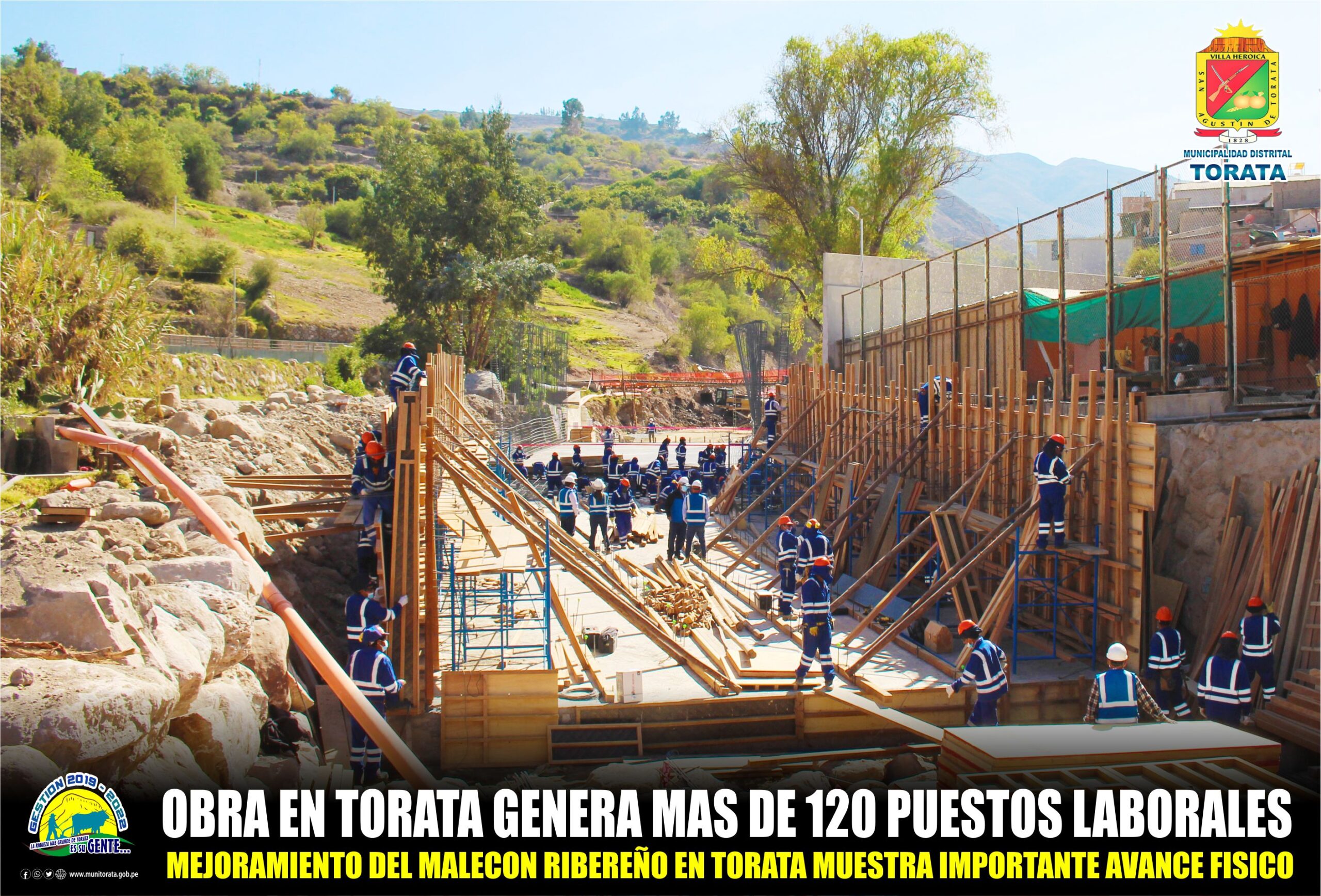 Más de 120 puestos laborales viene generando el proyecto del Mejoramiento del Malecón Ribereño en Torata, el cual tiene como objetivo generar un espacio seguro para el descongestionamiento vehicular en la Villa de Torata, así como brindar condiciones de seguridad para las viviendas aledañas al río Torata, así como generar espacios adecuados para el comercio y promover el turismo en el Distrito.