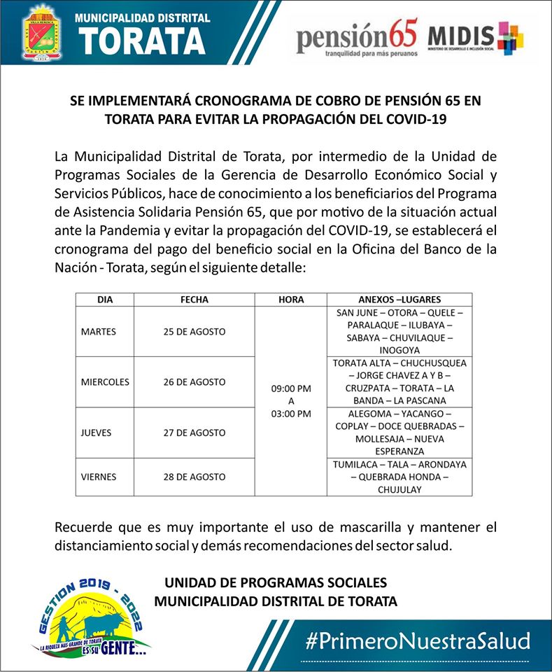 La Municipalidad Distrital de Torata, por intermedio de la Unidad de Programas Sociales de la Gerencia de Desarrollo Económico Social y Servicios Públicos, hace de conocimiento a los beneficiarios del Programa de Asistencia Solidaria Pensión 65, que por motivo de la situación actual ante la Pandemia y evitar la propagación del COVID-19, se establecerá el cronograma del pago del beneficio social en la Oficina del Banco de la Nación – Torata, según el siguiente detalle: