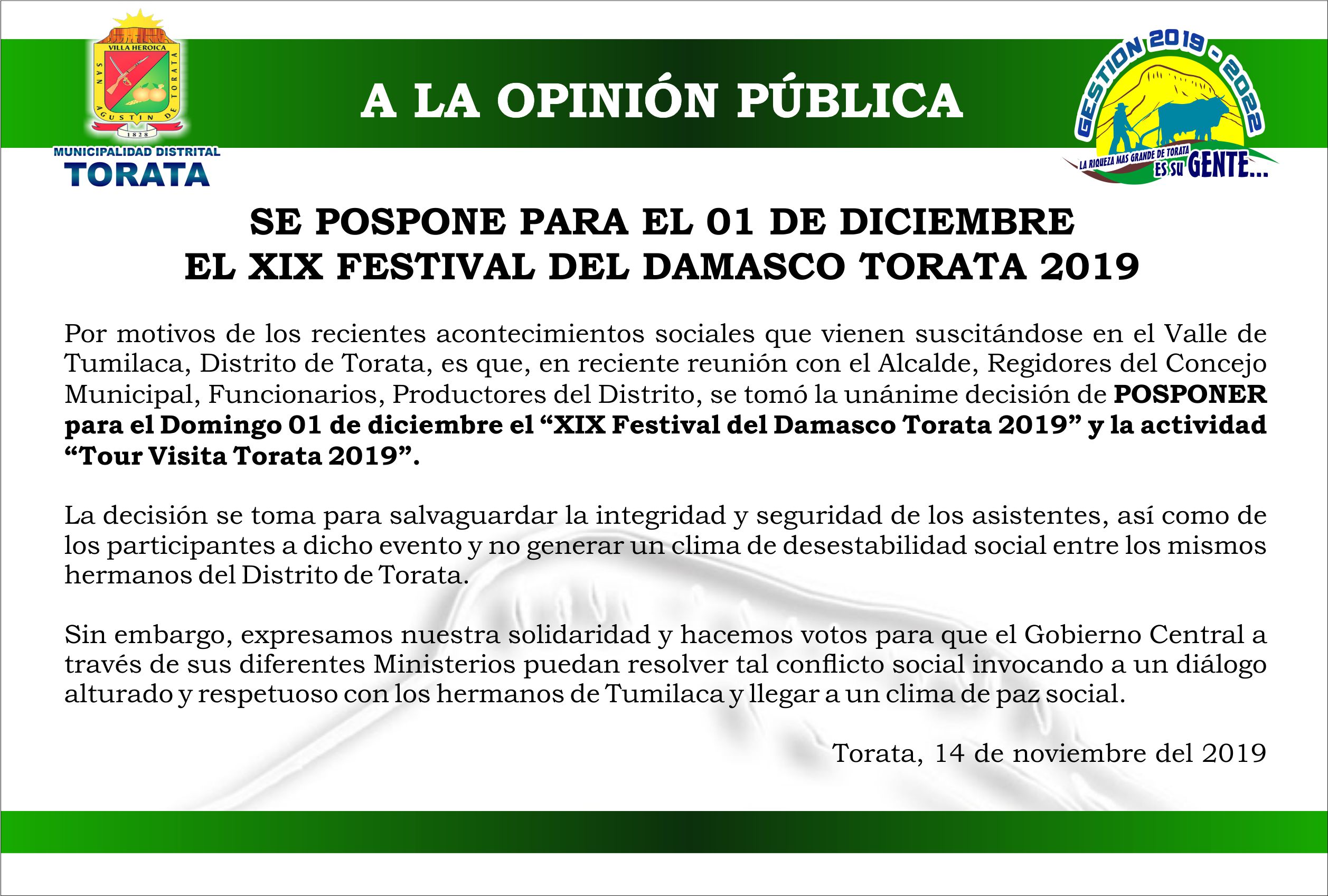Por motivos de los recientes acontecimientos sociales que vienen suscitándose en el Valle de Tumilaca, Distrito de Torata, es que, en reciente reunión con el Alcalde, Regidores del Concejo Municipal, Funcionarios, Productores del Distrito, se tomó la unánime decisión de POSPONER para el Domingo 01 de diciembre el “XIX Festival del Damasco Torata 2019” y la actividad “Tour Visita Torata 2019”.