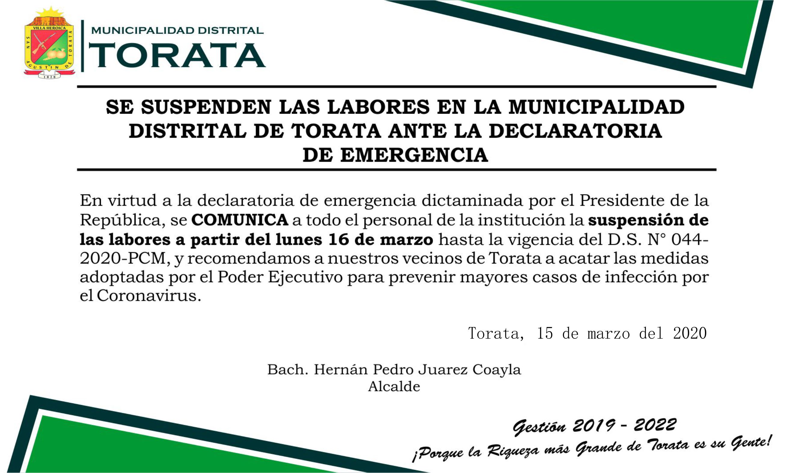 En virtud a la declaratoria de emergencia dictaminada por el Presidente de la República, se COMUNICA a todo el personal de la institución la suspensión de las labores a partir del lunes 16 de marzo por el plazo de 15 días calendario según el D.S. N° 044-2020-PCM, y recomendamos a nuestros vecinos de Torata a acatar las medidas adoptadas por el Poder Ejecutivo para prevenir mayores casos de infección por el Coronavirus.