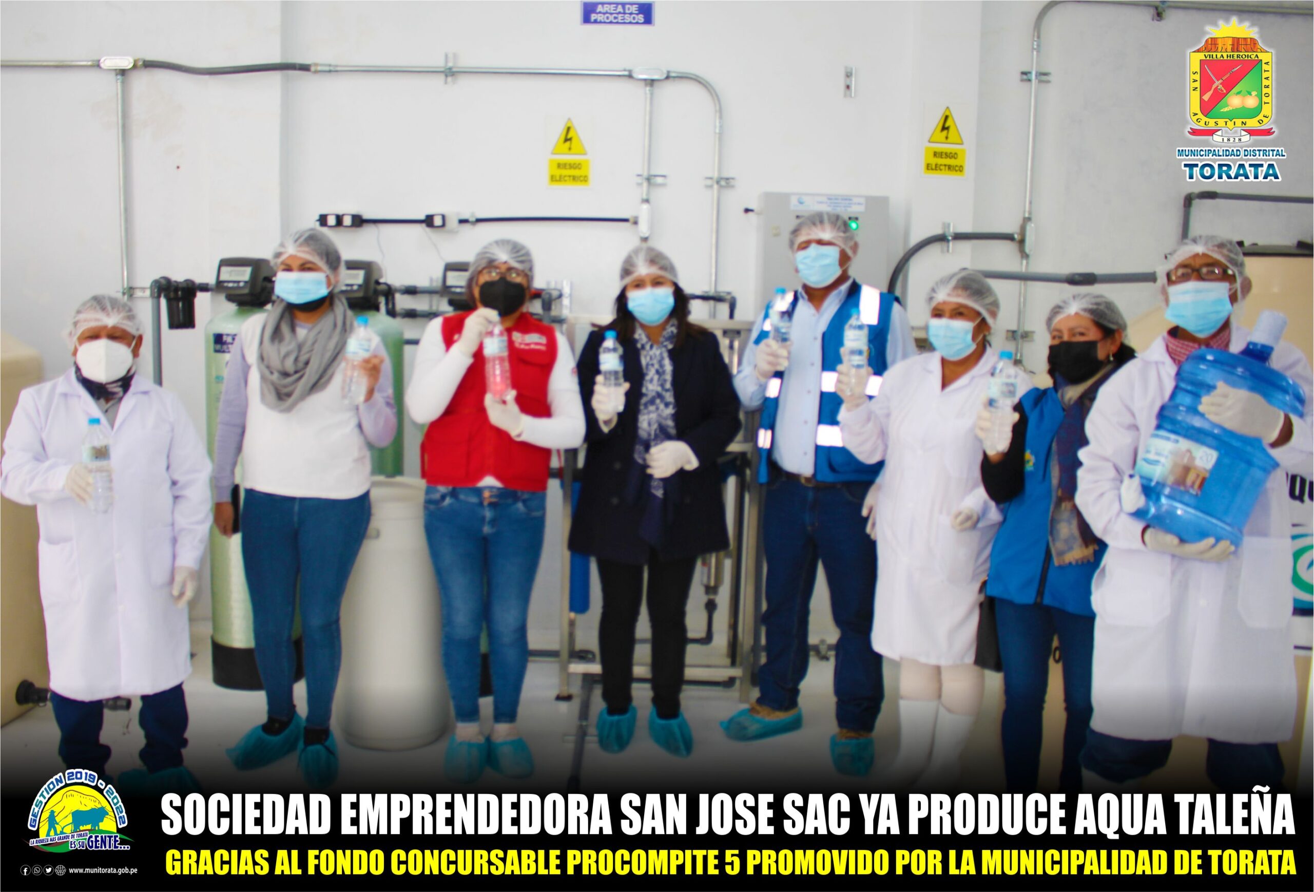 Gracias al Fondo Concursable PROCOMPITE 5, promovido por la Municipalidad Distrital de Torata, la Sociedad Emprendedora San José SAC pone en funcionamiento la Planta Procesadora de Agua de Mesa sin gas denominada “Aqua Taleña”, producto que cuenta con registro sanitario y contribuye al desarrollo economico en el Poblado de Tala en el Distrito de Torata.